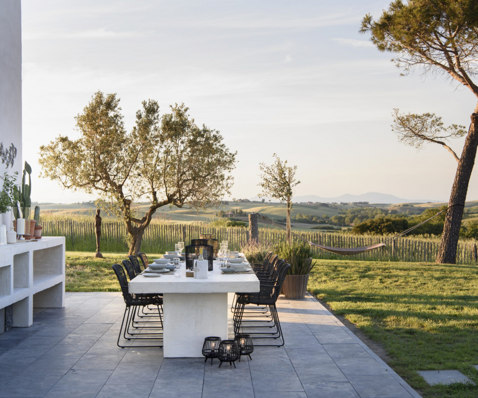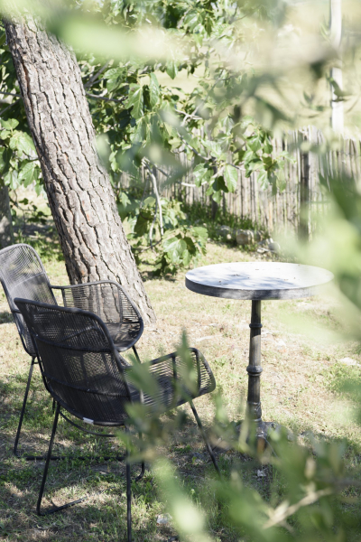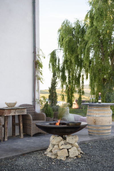 Das Außenareal der Casale della Luna ist so angelegt, dass es vielmehr zum gleichberechtigten Lebensbereich wird als nur eine Erweiterung des Interieurs darstellt. Dafür sorgen der Essbereich mit von Dennis Kaiser entworfenem Outdoor Mobiliar und der Garten mit zahlreichen malerischen Rückzugsorten. Eine über 100 Jahre alte Weide spendet im Sommer wohltuenden Schatten. Außerdem machen ein aus Mortex hergestellter Pool mit Holzterrasse und die Lounge Area mit Outdoor Teppich und Sitz- und Liegesäcken das Draußen wohnlich. Ähnlich wie der Ofen im Wohnzimmer ist der Feuerring aus der Schweiz der Treffpunkt unter freiem Himmel. Das Designerstück erfreut sowohl das Auge, den Magen – die Eigentümer empfehlen am Morgen mit der Restwärme und etwas Holz die Zubereitung von Spiegeleiern – als auch den Körper, wenn die Temperaturen am Abend sinken.