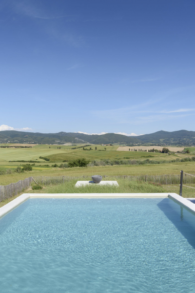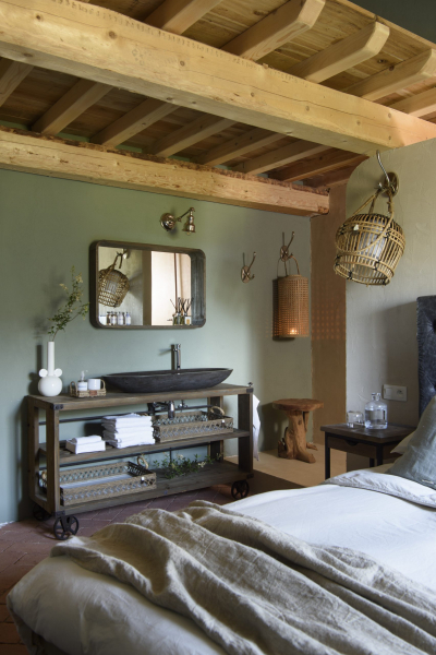 In dem 1920 erbauten Anwesen verfügt jedes der insgesamt sechs Schlafzimmer über ein Badezimmer mit Dusche und Waschbecken. Diese sind zum Teil aus chinesischem Blaustein oder sogenanntem Mortex, mineralischem Mikromörtel, handgefertigt. Die Aussichten vom Bett – und je nach Zimmer auch von der frei stehenden Badewanne – variieren: Von der ikonischen Hügellandschaft der Toskana über den Lago di Santa Luce bis hin zu den Alpen in der Ferne. Die Original-Terrakotta-Fußböden sind in allen Räumen vollständig restauriert, zwei Schlafzimmer haben zusätzlich Platz für zwei Betten bzw. Gepäckstücke im Mezzanin, die über eine Leiter erreicht wird.