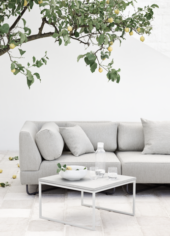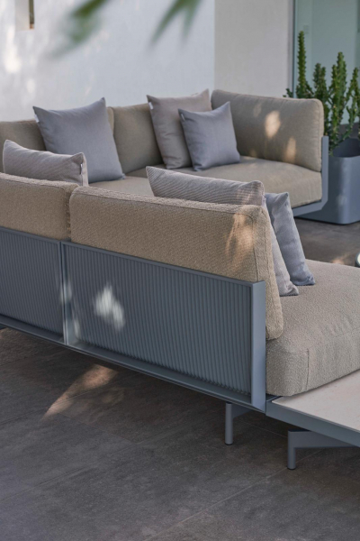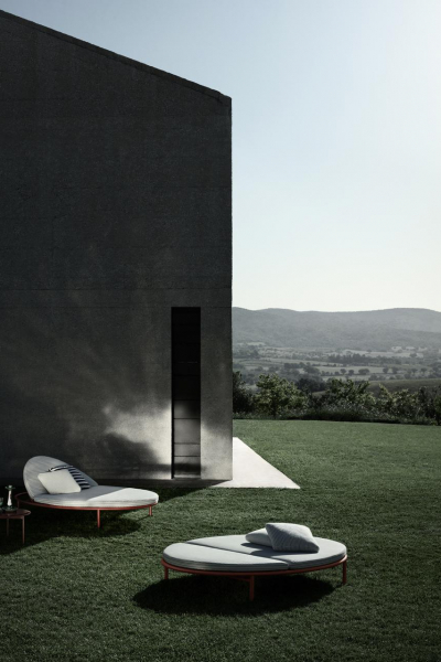 Das Solaria-Sofa von Poltrona Frau lässt sich um weitere Gartenmöbel wie Stuhl und Tisch erweitern