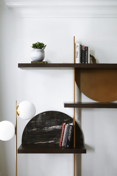 Um einen stimmigen Gesamteindruck zu realisieren, kombinierte Melissa Bolivar dazu außergewöhnliche, maßgeschneiderte Möbelstücke: „Ich wollte, dass das Projekt einen starken Sinn für Geometrie hat. Deshalb haben wir viele Möbelstücke entsprechend entworfen. Eines meiner Lieblingsstücke ist unser „Marluna“-Regal. Es besteht aus halbmondförmigem Marmor und dreieckigen Messingformen, die eine beeindruckende Kulisse für Bücher und Accessoires bilden. Es sind die maßgeschneiderten Details, die dem Projekt seine Individualität und Identität verleihen.“