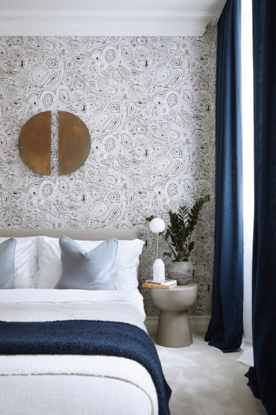 Auch im Hauptschlafzimmer spielt Samt eine große Rolle. Hier lenkt ein maßgefertigtes Kopfteil aus Samt vom Boden bis zur Decke den Blick nach oben und verleiht dem Raum eine außergewöhnliche Pracht. Gegenüber befindet sich eine ruhige Leseecke mit einem individuell geschwungenen Sessel und handbemalten Paravents, die von der Art Noveau-Ära inspiriert sind.