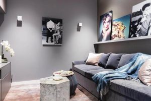 Wir mögen ja die Idee, das Wohnzimmer Fernseher-frei zu gestalten und stattdessen einen kleinen Raum zum Filmeschauen herzurichten – bei Platzmangel ggf. in Kombination mit einem Gästezimmer. Der wichtigste Aspekt: die Gemütlichkeit. Ein Sofa mit Veloursbezug, abgetönte Farben und ein weicher Teppich sind die Komponenten, die einen entspannten Abend garantieren. Damit es optisch nicht zu langweilig wird: Wie wäre es mit ein paar Filmzitaten in Standbild-Form?