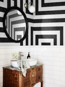 Gerade bei kleinen Räumen plädieren wir für eine Rundum-Tapete! Hier kann der Mut zum Muster ausgiebig erprobt werden, ob mit einem streng grafischen Dessin wie in unserem Beispiel unten oder klassischeren Motiven. Schließlich muss man sich hier wohl kaum darum sorgen, dass der Raum (noch) kleiner wirken könnte.
