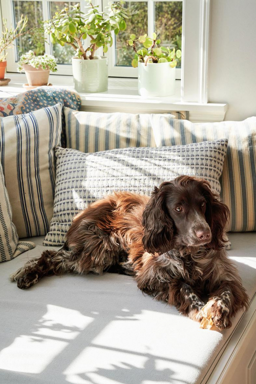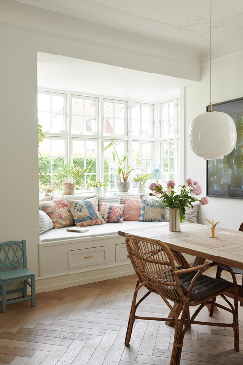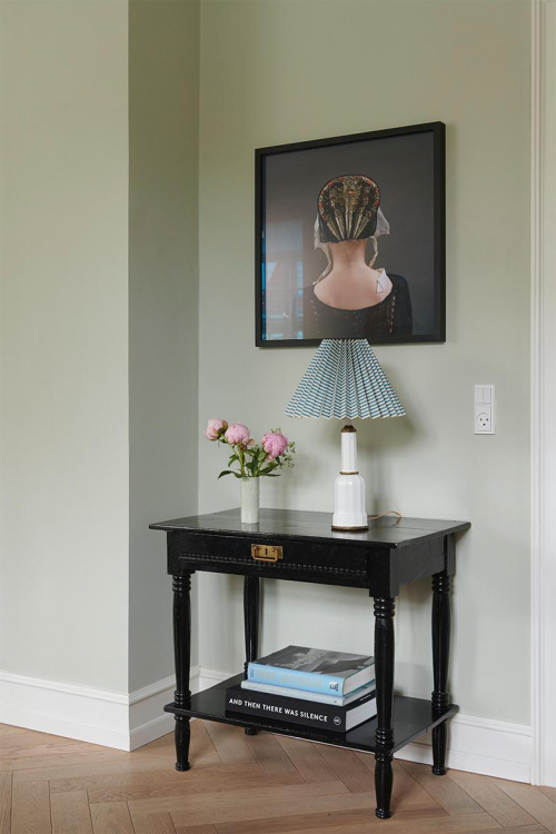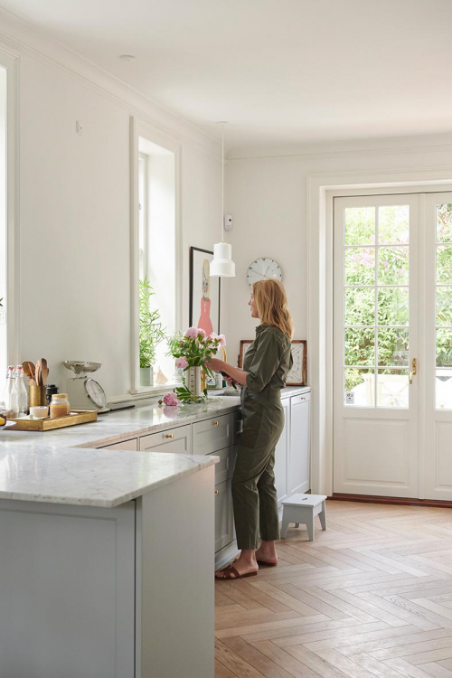 Besonders wichtig war den Hauseigentümern bei der Renovierung die Qualität der Materialien, insbesondere die des Holzbodens. Und auch die feinen Details lagen dem Architektenpaar am Herzen: Paneele, Stuck und Fliesen im Badezimmer wurden restauriert oder mit Bedacht ausgewählt. Außerdem arbeiteten Sara und ihr Mann viel mit Eiche und mit grau gestrichenen Einbaumöbeln. Warum gerade grau? „Ich finde, eine graue Farbe verleiht den Räumen immer Wärme und Tiefe“, erklärt sie. Für Farbkleckse sorgen Kunstwerke an den Wänden sowie Kissen, Lampen und Accessoires.