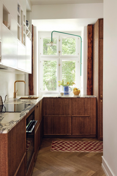 Einen Allrounder gibt es nicht unbedingt, denn es kommt auf das Produkt an: Holz und Linoleum benötigen eine andere Pflege als eine Marmor- oder Quarzplatte. Erstere sind Naturmaterialien, das heißt, sie sollten grundsätzlich auch mit natürlichen Pflegemitteln wie Öl und Wachs oder lauwarmen Wasser mit ein bisschen natürlicher Seife behandelt werden, denn Chemie würde die Fasern zu sehr angreifen. Prinzipiell kann man schon viel lösen, in dem man einfach immer schnell hinterherputzt und Rotwein- oder Rote-Beete-Flecken gar nicht erst einsinken lässt. Denn dagegen ist die beste Arbeitsplatte nicht gewappnet. Sinnvoll ist zudem ein durchdachtes Mülltrennsystem, das man unter der Spüle einbauen kann – mit möglichst kurzen Wegen zu den Flächen, wo Abfälle entstehen.