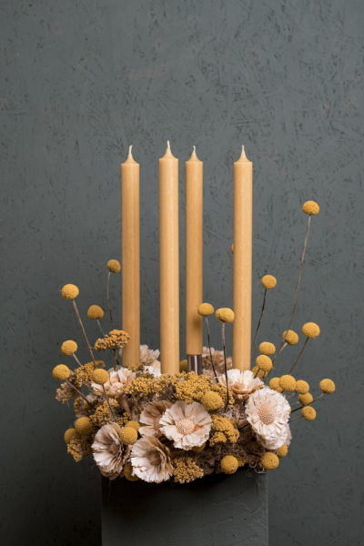 Nach dem sie sich bereits in sämtlichen Vasen eingenistet haben, ist der Einsatz von Trockenblumen bei Adventskränzen nur konsequent. Zudem bringen sie sofort einen modernen Touch und bereiten auch über die vier Adventssonntage hinaus Freude. Wer lieber auf frisches Grün setzt: auch Sukkulenten eignen sich wunderbar. Das Stilgeheimnis moderner Kränze sind übrigens nicht nur die Materialien, sondern auch das Spielen mit verschiedenen Höhen. Während klassische Varianten kompakt gebunden werden und das höchste Element die Kerzen sind, darf es beim zeitgenössischen Exemplar ruhig lockerer zugehen und einzelne Stiele auch mal über die Kerzen hinauswachsen.