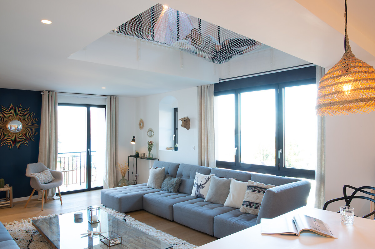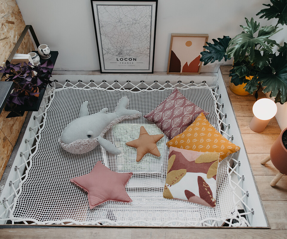 Wer schon einmal auf einem Katamarannetz lag, hat bestimmt auch darüber nachgedacht, dieses Liegegefühl in die eigenen vier Wände zu transportieren. Häufig wird der Gedanke aufgrund Platzmangels nicht weiter verfolgt. Ein Trugschluss, denn die geflochtenen Wohnnetze von LoftNets lassen sich horizontal als Liegefläche in den Boden einbauen und erweitern damit die Nutzfläche um eine Ruhezone mit tiefen Einblicken. Wahlweise schließen sie bis dato ungenutzte Lücken.