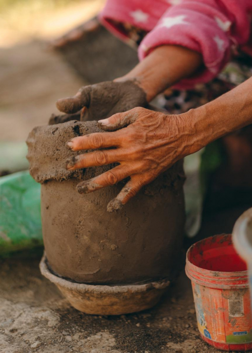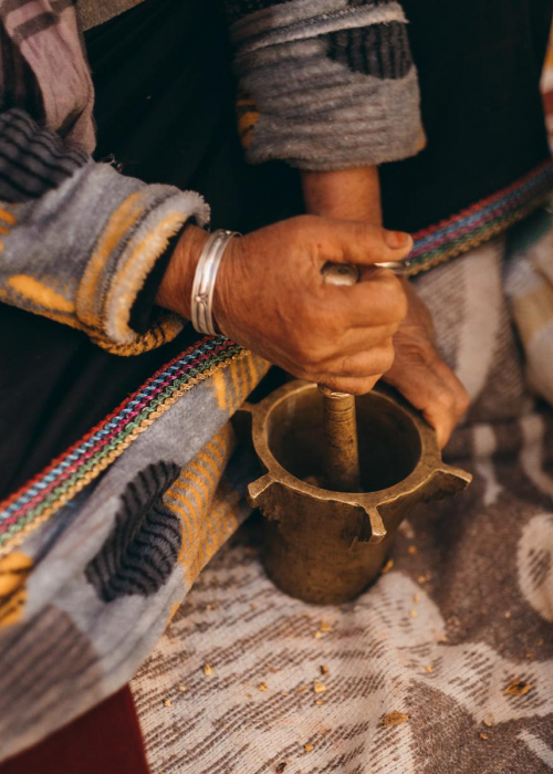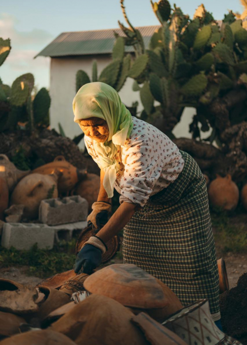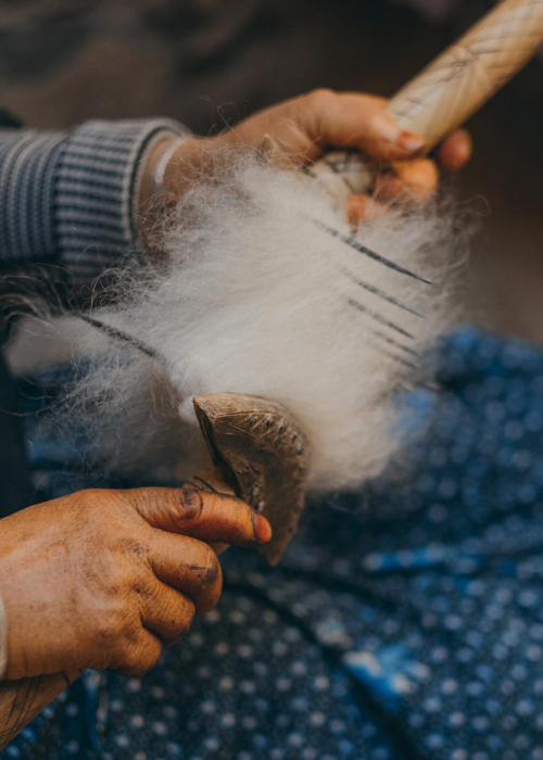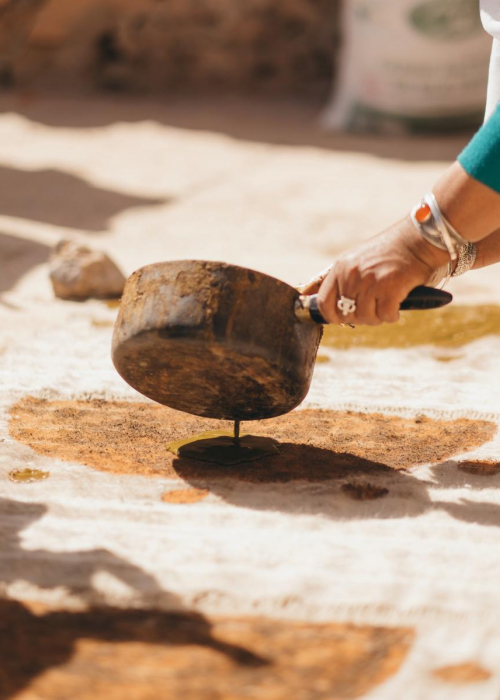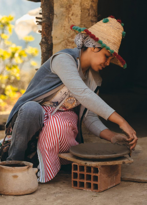 Das Besondere an den tönernen Haushaltswaren: Sie werden ohne Drehscheibe in uralter Technik von Hand modelliert und am offenen Feuer oder im Grubenofen gebrannt. Die gesamten Materialien, einschließlich der mineralischen Pigmente zum Bemalen, stammen aus direkter Umgebung. So ist es auch bei den handgewebten und mit Henna verzierten Wollstoffen etwa für Kissen oder Decken, denen die Tradition der Brautkopftücher zugrunde liegt. In vielen einzelnen Schritten wird dafür die Wolle des Siroua- Schafes aufbereitet und versponnen.