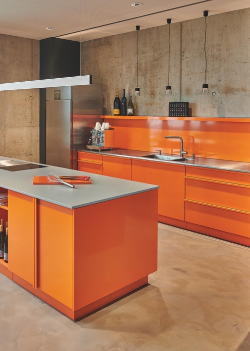 Für ganz Mutige: die Popstahl-Küche in Hochglanz-Orange mit Edelstahl-Arbeitsflächen. (Foto: Anton Brandl)