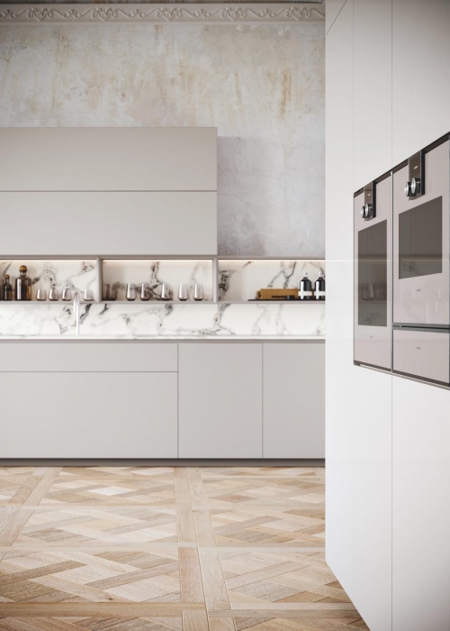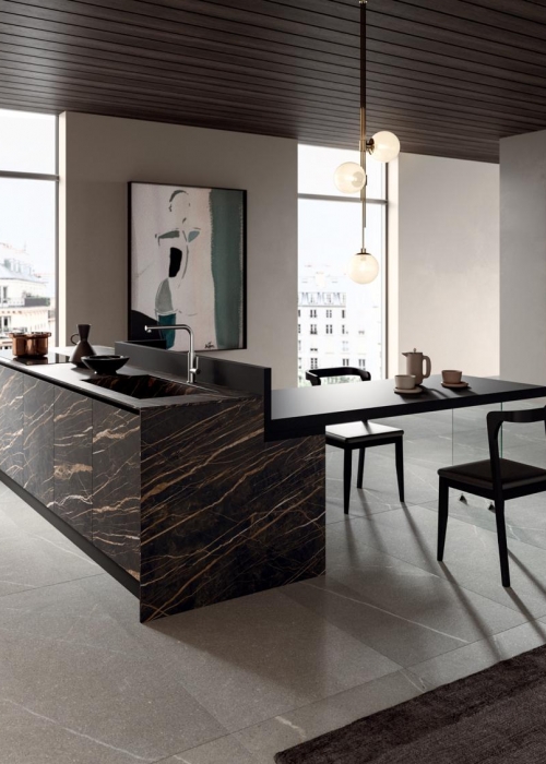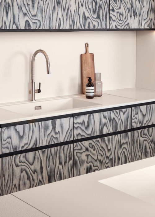 Alpi stellt die ziemlich cool gemaserte Oberfläche für Küchenmodell „Archetipo“ von L'Ottocento.