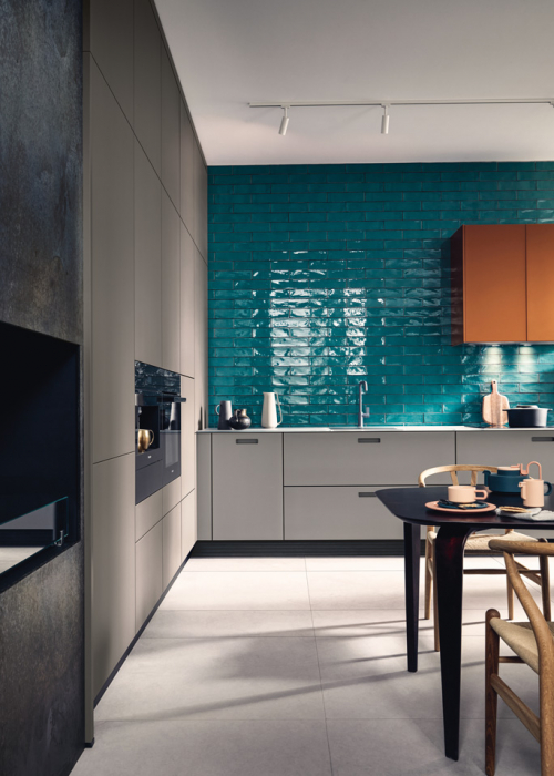 Gute Idee: Mattgraue Fronten lassen sich wunderbar mit glänzenden Metro-Fliesen beleben. (Bild und Küche: Next 125)