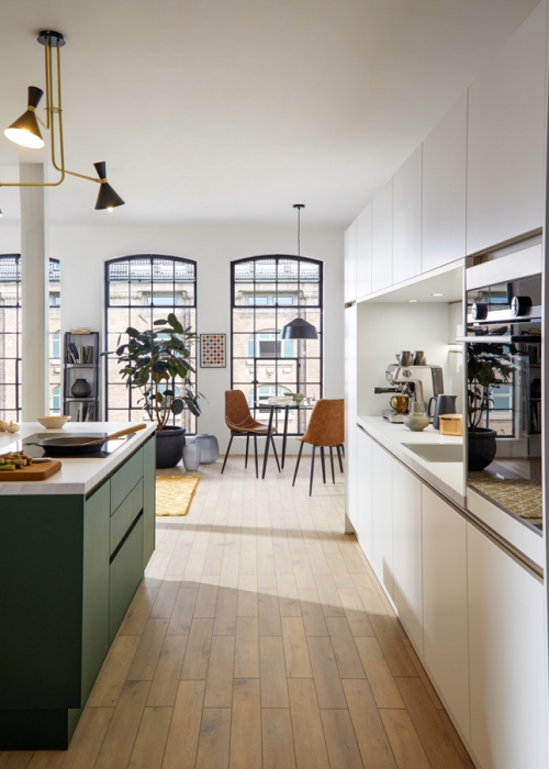 Modell „54.160“ mit grüner Insel vis-à-vis der weißen Küchenzeile (Contur Küche)