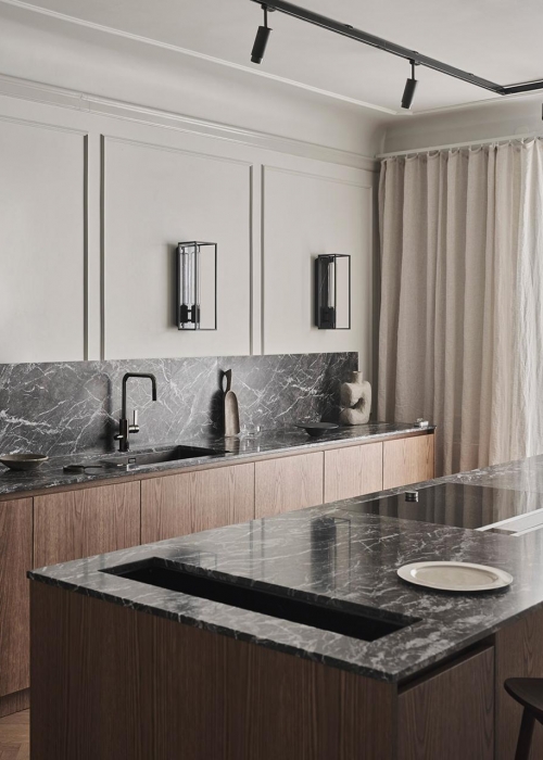 Live in Stockholm: Kücheneinbau The Nordic Elegance mit Holz und schwarzem Marmor (Nordiska Kök)
