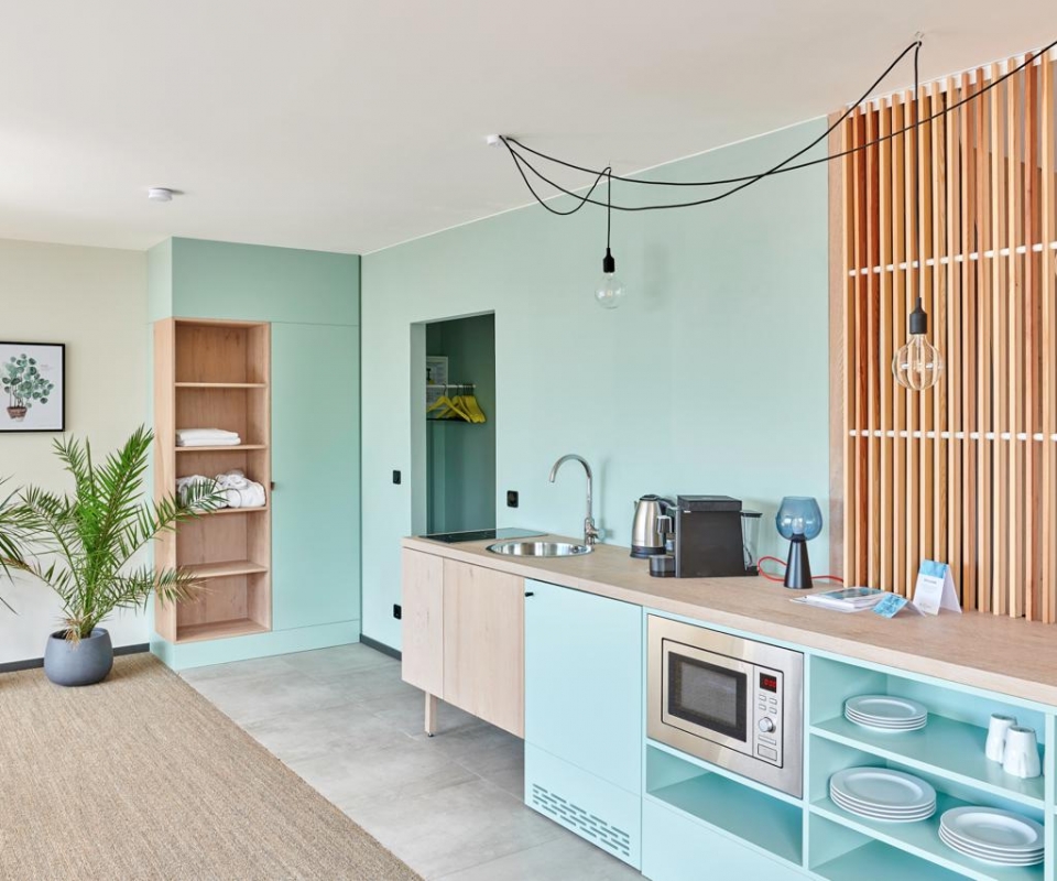 Einen frischen Mintton zu hellen Holzelementen wählte Studio Aisslinger für die jüngst umgestalteten Apartments des Whitmann Resorthotels in Schleswig-Holstein