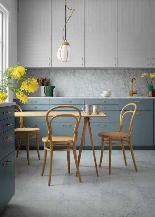 Marmor, Terrazzo und alles, was eine natürliche Steinoberfläche suggeriert, sind aus dem modernen Interiordesign nicht mehr wegzudenken – aus den gleichen Gründen, wie die Vorliebe für alles Grüne (siehe oben). Es wundert also kaum, dass auch Küchenhersteller sich auf diesen Trend eingelassen haben, der alles andere als schnelllebig ist, sondern Ausdruck eines Lebensgefühls. Dabei sind es freilich nicht immer echte Steinplatten, die vor oder auf Schränke montiert werden, sondern meist sehr intelligente Materialien, die einer täglichen Beanspruchung lange Zeit standhalten sollen.