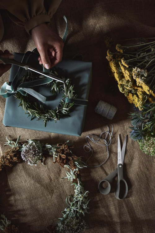 Schön verpackt ist der erste Schritt. Kreativ verziert der zweite. Textilien und Botanik ins Geschenkarrangement einzufügen, verleiht schlichten Einbänden Raffinesse und aufwendiger Verpackung einen ganz individuellen Touch bzw. im Fall von Eukalyptus-, Lorbeer- oder auch Olivenzweigen sogar eine persönliche (Duft-)Note.