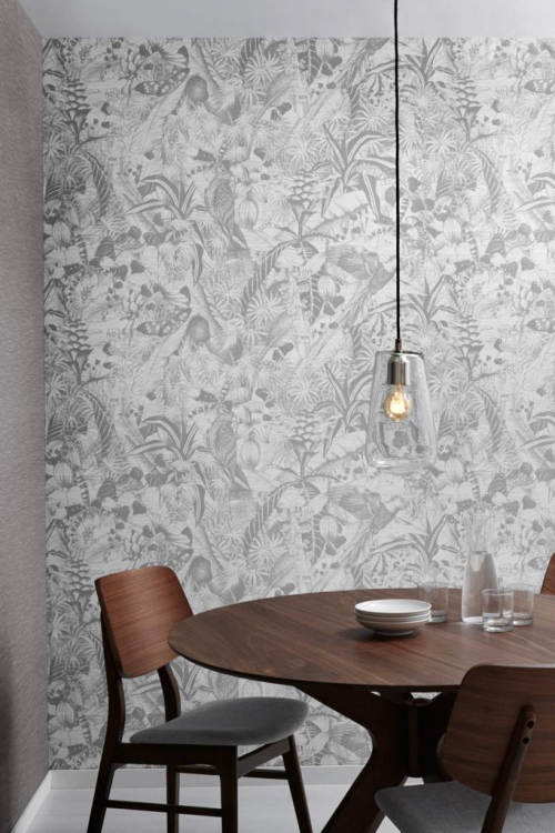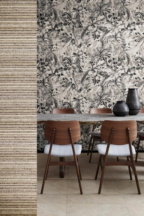 Salonga ist eindrucksvoll, aber auch sehr groß. Um all die Details des Dschungels und die darin versteckten Tieren zu genießen, braucht es einen großen Raum. Dennoch lassen sich auch auffällige Dessin wie Kwazulu, Pool und Kiondo gut in weniger großzügigen Räumlichkeiten verwenden, um Akzente an der Wand zu setzen. Wer es dezenter mag, wählt den Uni Kalahari oder Faux-Uni Lake. Ihre elegant metallisch-schimmernden Textiloberflächen schaffen sofort eine wohnliche Atmosphäre.