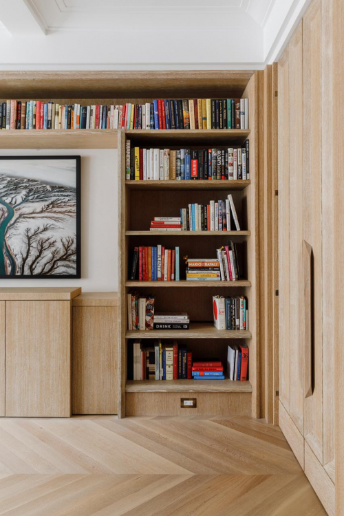 Verschiebbare Wände, Türen, die aussehen wie Schranktüren, jedoch in ein anderes Zimmer führen, ein geheimer Spirituosenschrank im Wohnzimmer, ein Arbeitszimmer im Arbeitszimmer samt verstecktem Fernseher – was sich nach Zaubervorführung oder Science Fiction-Film anhört, wurde im Appartement in Carnegie Hill Realität. Denn dank geschickter Planung von MKCA und der Aufgeschlossenheit der Eigentümerfamilie lassen sich alle Räume immer wieder neu konfigurieren und nutzen. Die Verschmelzung von Funktionen in allen Größenordnungen – von Räumen, die mehreren Zwecken dienen, bis hin zu sich wandelnden Möbelstücken – ist ein Markenzeichen von MKCA Architecture und ein wesentlicher Bestandteil des Appartements. „Mit Kunden zusammenzuarbeiten, die uns herausfordern und bereit sind, Zeit und Energie zu investieren, um neue Dinge auszuprobieren, ist wirklich alles, was wir brauchen, um unsere beste Arbeit zu leisten“, resümiert Michael K Chen.