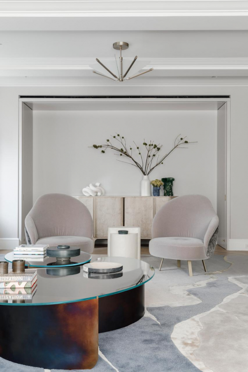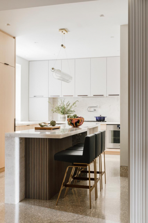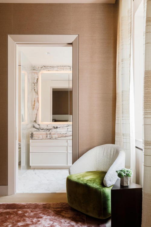 Alle architektonischen Eingriffe von MKCA gehen auf die grundlegende Motivation des Projekts zurück: die Wohnung in ein fließendes, elegantes, modernes Zuhause zu verwandeln und gleichzeitig gewagte architektonische wie ästhetische Entscheidungen zu treffen. „Von Anfang an haben uns die Kunden gebeten, sie aus ihrer Komfortzone herauszuholen. Das Paar hatte ganz klare Vorstellungen davon, wie es leben wollte und wie bestimmte Räume funktionieren sollten“, sagt Michael K Chen. Der windradförmige Grundriss der Wohnung ließ dabei viel Gestaltungsfreiheit und fließende Übergänge zwischen den einzelnen Räumen zu.