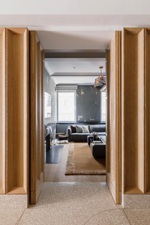 In der kompletten Upper East Side Wohnung lassen sich Türen schwenken oder wegschieben und Zimmer gezielt nach Bedarf umgestalten. Das gibt der Familie Raum für die wichtige gemeinsame Zeit und ermöglicht gleichzeitig eigenständige Aktivitäten. Diese Strategie wird bereits beim Betreten der Wohnung über den Aufzug deutlich. Die raumhohe Eingangstür ist so konstruiert, dass sie dank schwenkbarer Scharniere ständig offen bleiben kann. Und auch die Wand zwischen dem Eingangsvorraum und der Küche kann einfach weggleiten. Generell haben die Architekten klassische Wände aus der Wohnung fast komplett verbannt. Dadurch sind Räume entstanden, die bei Bedarf ineinander übergehen können.