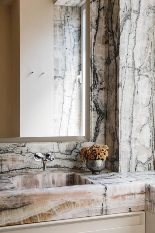 Das fließende Gefühl wird durch die durchdachte Anwendung von Materialien im ganzen Gebäude akzentuiert. Ein gegossener Terrazzoboden begrüßt die Besucher im Vorraum des Aufzugs und führt durch Küche, angrenzende Speisekammer, Schlafzimmerbereich, Garderobe, Gästetoilette und zurück zur Galerie. Von dort geht es weiter in die Wohn-, Ess- und Medienbereiche. So zieht der Boden durch ein verspieltes und ausdrucksstarkes Muster buchstäblich Verbindungen von Raum zu Raum.