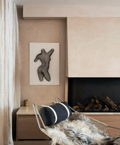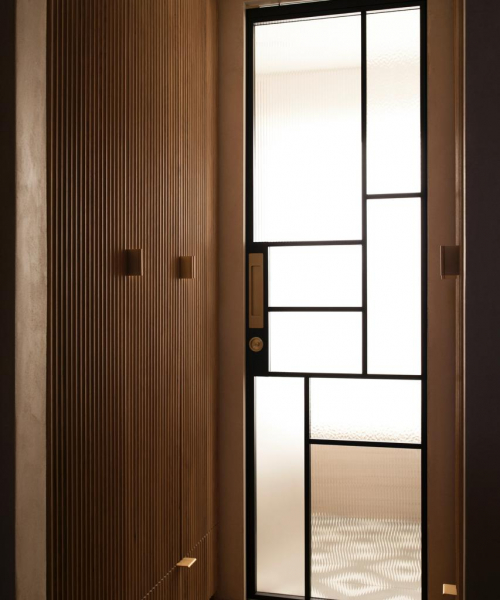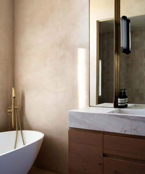 Bei der Farbpalette zeigten sich die Architekten betont zurückhaltend: Erdige Töne herrschen überall im Haus vor, hinzu kommen viele natürliche Materialien, Textilien und rustikale Accessoires. Als verbindende Elemente zwischen den verschiedenen Räumen fungieren strukturierte Lehmwände und Eichenparkett, aber auch geriffeltes Holz, Marmor und Messing finden sich in allen Etagen.