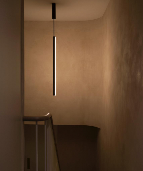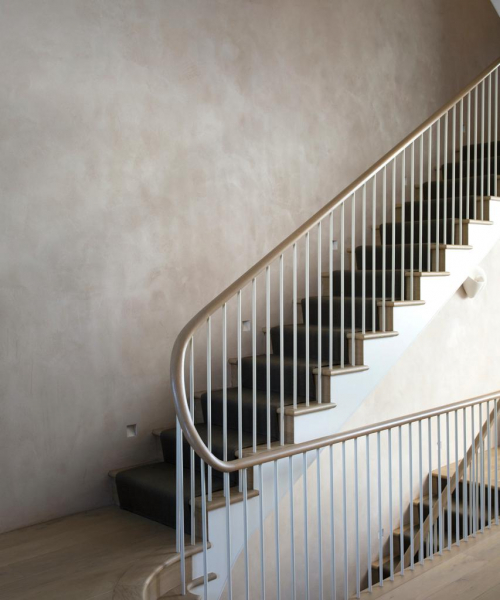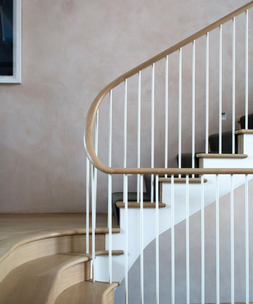 Ein großer Schritt bei der Renovierung war die Verlegung der Haupttreppe. Dadurch wurde ein fließenderer Übergang zwischen den einzelnen Räume geschaffen und der Platz maximiert. Die zentral gelegene Treppe öffnet sich nun zum neuen Küchen-, Ess- und Wohnbereich im erhöhten Erdgeschoss. Ein besonderes Highlight ist das hohe Haupttreppenhaus, das mit geschwungenen Wänden und einem Oberlicht besticht. Eine lineare Pendelleuchte in Kombination mit den weichen strukturierten Wänden schafft einen atmosphärischen Raum. Und der durchgehende Treppen-Holzhandlauf verbindet alle Etagen auch optisch miteinander.