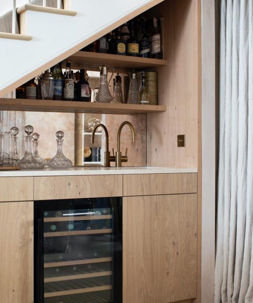 Während sich nun im Erdgeschoss ein gemütliches Familienzimmer mit einem offenen Kamin und einer maßgefertigten Cocktailbar, die geschickt in eine Nische im Treppenhaus platziert wurde, befindet, bieten die oberen Etagen Platz für ein Hauptschlafzimmer mit eigenem Bad, zwei Kinderzimmer, zwei Gästezimmer und ein Familienbad. Im erhöhten Erdgeschoss liegt der neue Koch-, Ess- und Wohnbereich.