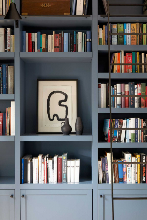 Die Wände des eher formellen Wohnzimmers und der Bibliothek sind mit „Bauwerk Limewash“-Farbe gestrichen