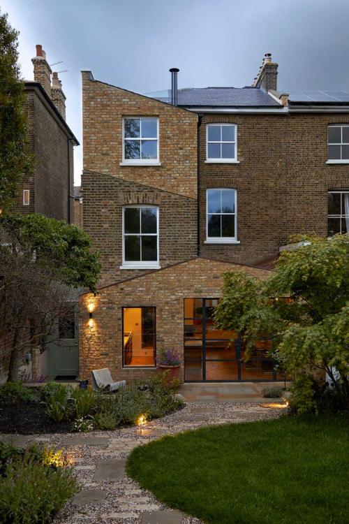 Erst vom Garten aus lässt sich die verspielte Geometrie des neuen Anbaus in seiner ganzen Raffinesse erkennen. So wurde die ursprüngliche Dachneigung im Anbau mit dem darunterliegenden Koch- und Wohnraum einerseits übernommen und zugleich gespiegelt. Das macht sich in den Londoner Stockziegeln als Muster erkennbar. Es wirkt, als wäre der Anbau harmonisch aus dem Stammhaus gewachsen – definitiv eine gelungene Herausforderung! Dekonstruierendes, rahmenloses Glas gliedert die Erdgeschoss-Rückfassade von der Decke aus und bricht gleichzeitig den Dachraum aus. Das Ergebnis: Eine Geometrie, die Höhe und Raum mit origamiartiger Struktur schafft.