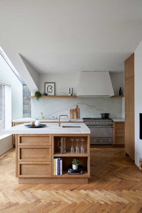 Der Dartmouth Park ist ein Stadtteil im Nordwesten Londons, in Camden. Hier reihen sich Backsteinfassaden beschaulicher Reihen- und Doppelhäuser aneinander: die klassische Vorstadtidylle. Von vorne sieht man auch dem redesignten Objekt sein Makeover nicht an, denn es bringt alles mit, was man von einem traditionellen viktorianischen Zuhause erwarten würde. Beim Betreten wird man begrüßt von einer Eichentreppe mit dekorativen Schnitzereien und einem charaktervollen Wohnzimmer mit restaurierten Fensterläden, Zierleisten und einem offenen Kamin. Doch schon vom Eingang schweift der Blick zur Rückseite des Hauses. Dort gibt eine Verglasung den Blick durch die Küche in den dahinterliegenden Garten frei.