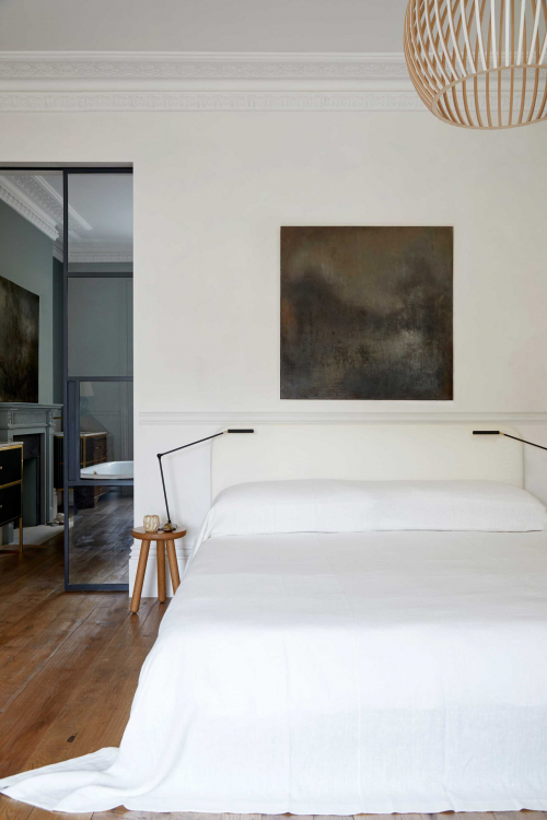 Im ersten Stock befindet sich das Hauptschlafzimmer, das mit einfachen, von Donald Judd inspirierten Kleiderschränken eingerichtet wurde. Im Kontrast dazu steht das luxuriöse Bad – ausgestattet mit einer Palette aus Schilfglas, Messing und Marmor.