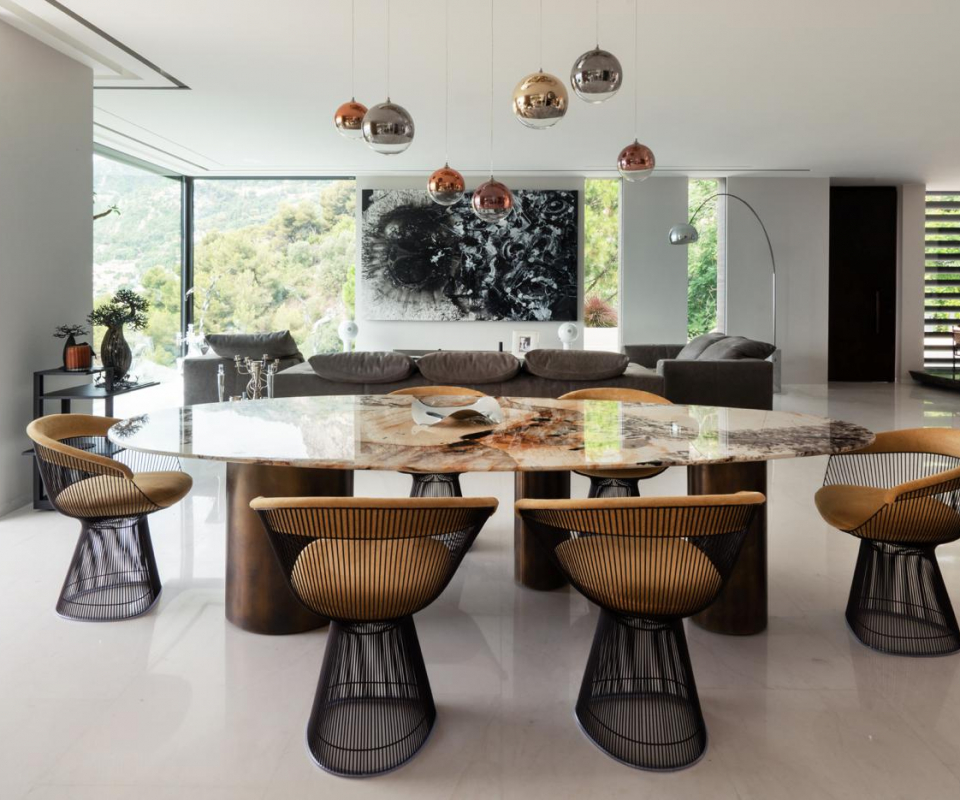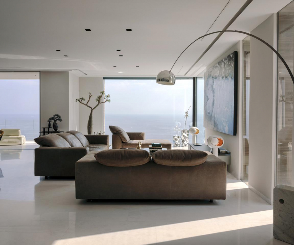 Bei der Innenausstattung legte Studio Donizelli Wert darauf, dass die Einrichtung weder dem Meer, dem Horizont noch der einzigartigen Natur der Côte d’Azur die Show stiehlt. Die hellen und glatten Fußböden reflektieren das Licht und gehen nahezu nahtlos in Wasser und Himmel über. In den Küchen dominiert gesinterter Stein von Lapitec in Weiß, aufgelegt auf einen Block aus Marmor. Das moderne Mobiliar ist in der Umgebung angepassten, neutralen Farben mit zurückhaltender Linienführung gewählt. Wenige, aber raffinierte Details ziehen die Blicke auf sich.