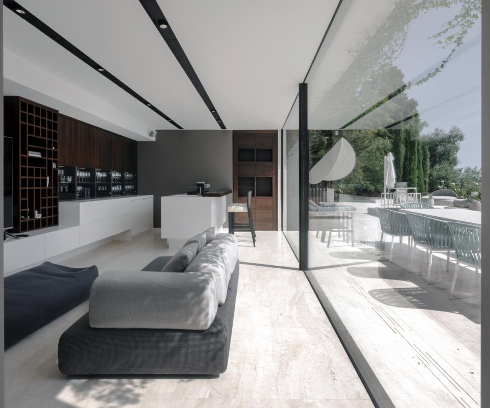 Das Gefühl der Durchlässigkeit von Innen- und Außenbereich erzielen die italienischen Architekten vornehmlich durch die raumhohen, rahmenlosen Fenster von Sky Frame. Selbst im geschlossenen Zustand erlauben sie schier grenzenlose Ein- und Ausblicke. Ein spektakulärer Luxus!