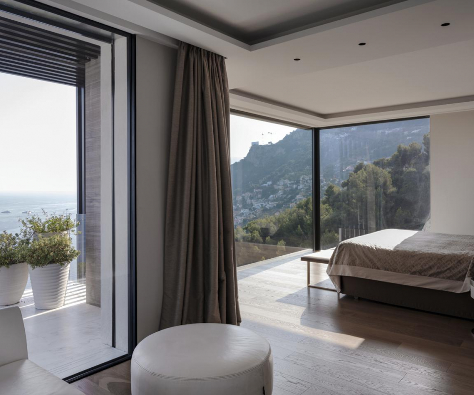 Die Morphologie des Hanggrundstückes in der Nähe von Monte Carlo bestimmt die Anordnung der drei Gebäudeteile des Privathauses. Ziel war es, uneingeschränkte Panoramablicke zu ermöglichen. So geben rahmenlose Fenster, transparente Balkonbrüstungen und zahlreiche Outdoor-Lounges den Blick auf die Bucht, das Land und die Lichter von Monaco frei.