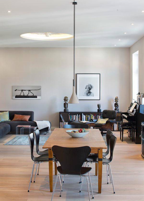 Helles Holz lockert dunkelgraue Wände auf. Möbel: Mater
