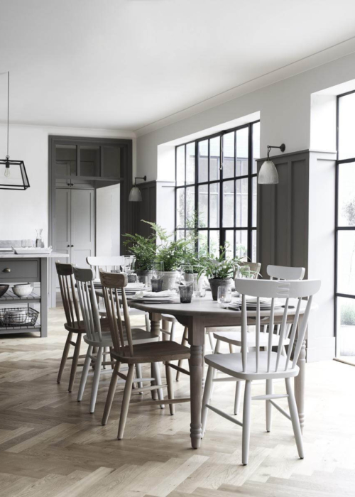 Die meisten Menschen entscheiden sich eher für ein helles Grau, aus Sorge es könnte sonst zu dunkel werden. Pastell- und Weißtöne, natürliche Materialien wie Leinen und verspielte Accessoires bringen schnell einen freundlichen Landhauscharakter. Das gelingt auch, indem man einen grau-gekälkten Fußboden mit Pastell- und Weißtönen kombiniert.