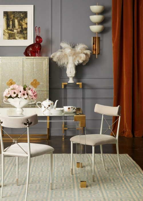 Durch ihre zurückhaltende Wirkung eignen sich graue Wände perfekt als Bühne für extravagante Bilder und Möbel. Bild via Jonathan Adler