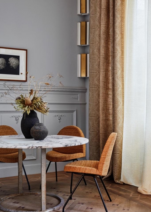 Passt gut zur grauen Wandfarbe von Little Greene: Holz und Ocker