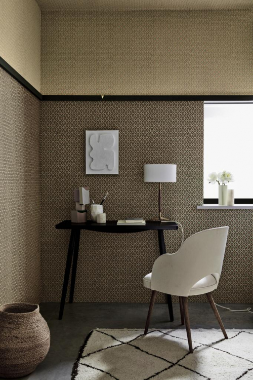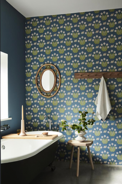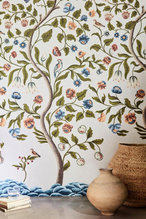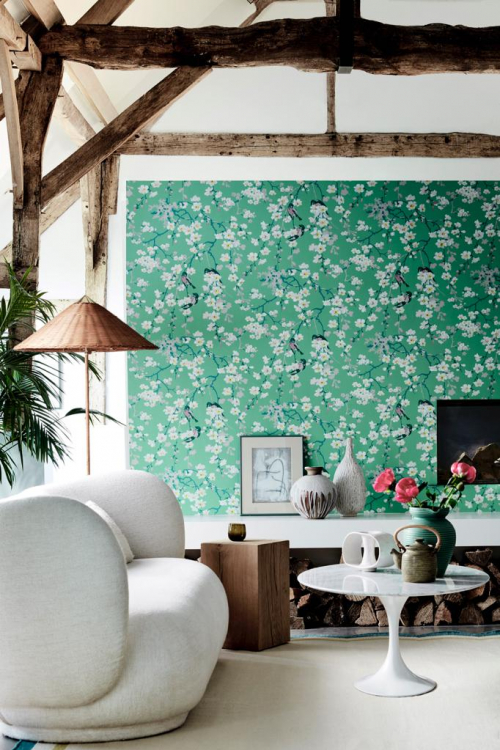 Das Motiv der Tapete „Millefleur“ stammt von einem der ältesten Wandteppiche in der Obhut des National Trust, aus dem Jahr 1478, der sich im Montacute House in Somerset befindet. Er ist aus Wolle und Seide gewebt und zeigt einen Ritter vor einem Hintergrund aus Hunderten von winzigen Blumen auf dunklem Grund. Ebendiese machte Little Greene zum Hauptmotiv und erhielt dabei die optisch textil anmutende Oberfläche.