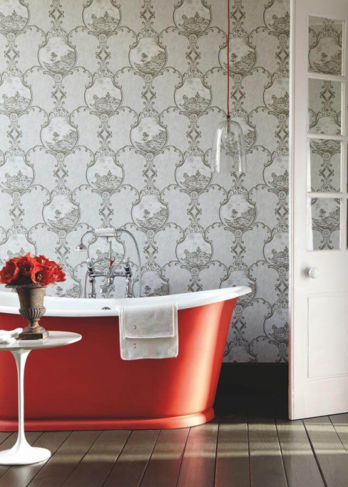 Vor der grauen Tapete von Little Greene darf die Badewanne ruhig auffallend sein