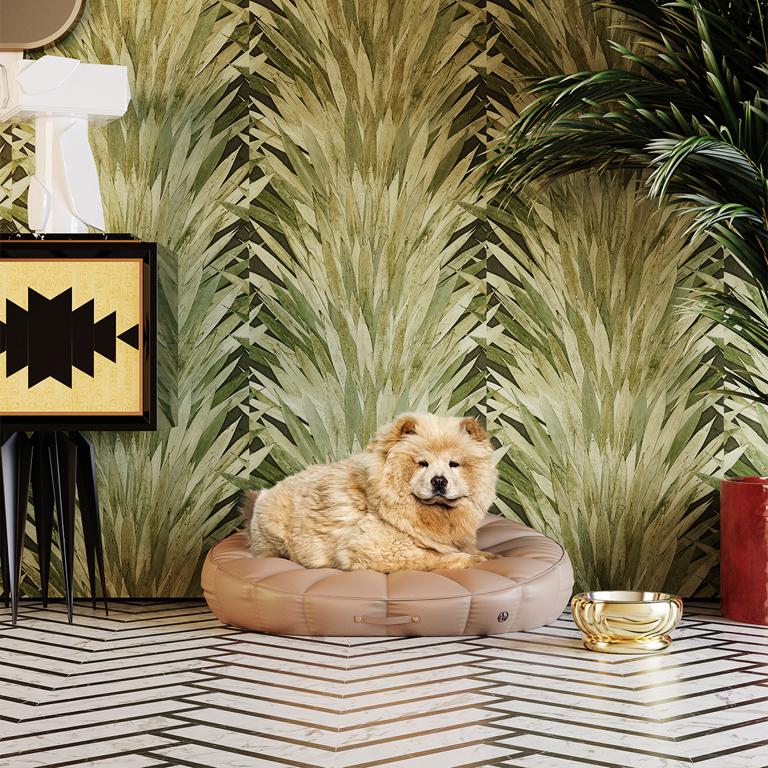 Für den perfekten Partnerlook gibt es Haustierbett Trudy von Made aus recyceltem Samt in Antik-Gold auch als Sofa in groß